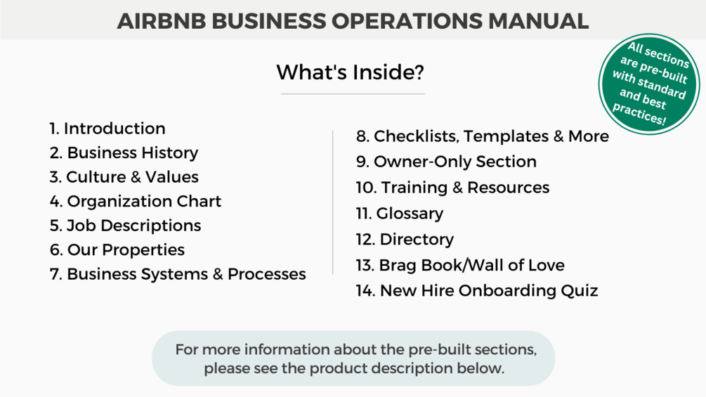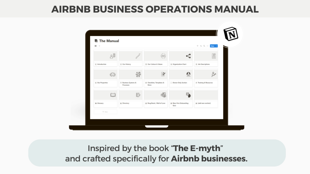 ✔️ Inspired by The E-myth: Read "The E-myth" but struggling to create an operations manual for your Airbnb business? All your systems are in your head but you don't know how to extract and/or neatly organize them in a single place? With this pre-built template, you don't have to create your manual from scratch.