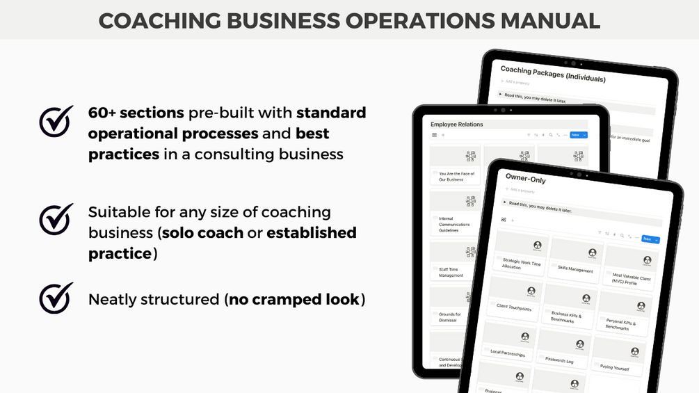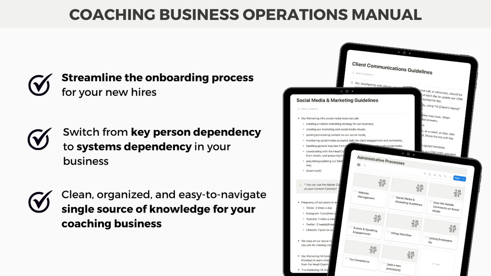 If you answer 'yes' to any of the above questions, then this Coaching Business Operations Manual is an essential tool that can transform the way your business operates, making it more efficient, scalable, and profitable.