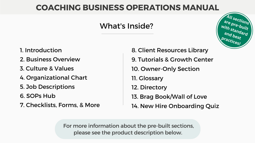 ✨ Your Operations Manual is a one-stop-shop of operational knowledge base for your business. It includes your coaching systems, processes, SOPs, workflows, checklists, best practices... It tells your employees: "This is how we do things here".