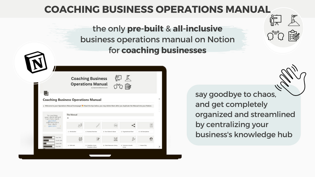 Perfect for coaching business owners who want to get completely organized and streamlined by centralizing their business's knowledge hub, implement structured systems in their business, save time on admin work, and ensure seamless daily operations.
