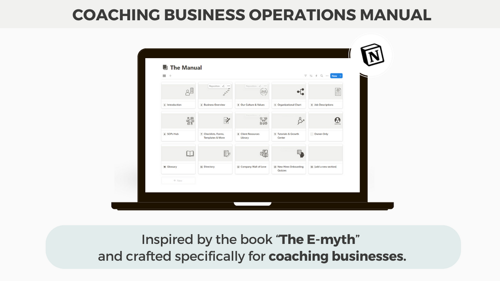 ✔️ Inspired by The E-myth: Read "The E-myth" but struggling to create an operations manual for your coaching business? All your systems are in your head but you don't know how to extract and/or neatly organize them in a single place? With this pre-built template, you don't have to try to set up a manual from scratch.