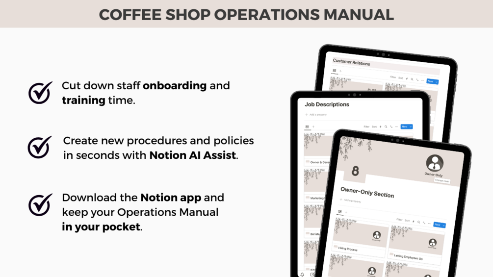 You'll get a neatly structured operations manual on a customizable all-in-one Notion dashboard with 60+ sections pre-packed with best practices in coffee shop operations