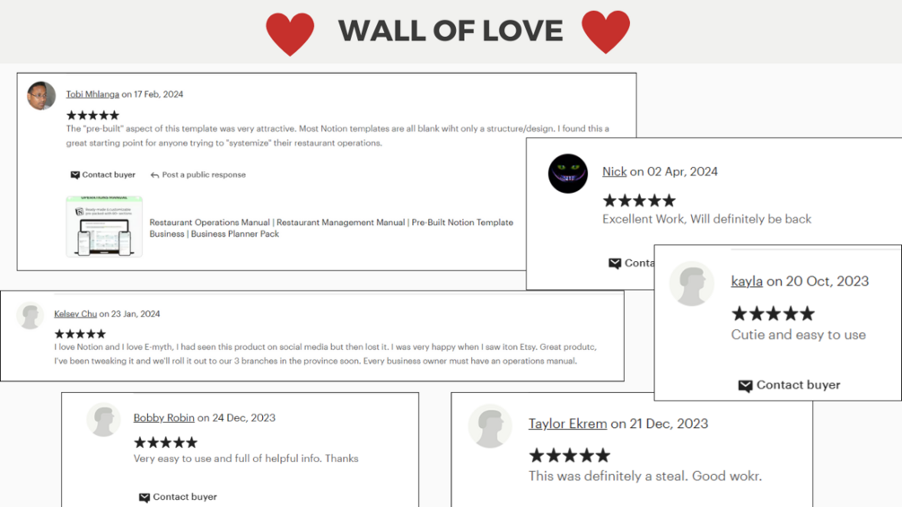 Operations Mavenue's Wall of Love â¤ď¸You'll get a neatly structured operations manual on a customizable all-in-one Notion dashboard with 60+ sections pre-packed with best practices in restaurant operations