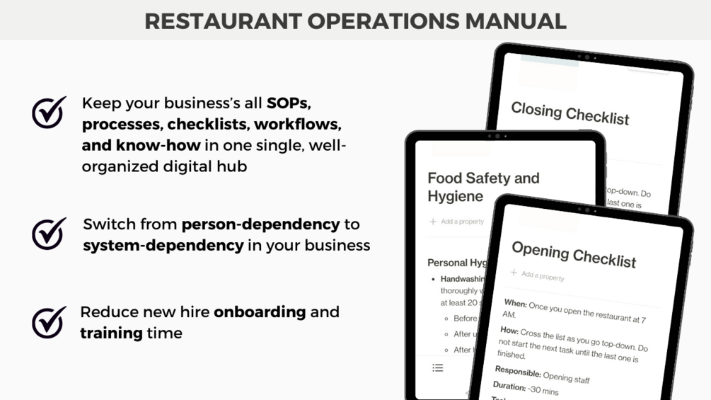 đ This is a comprehensive and customizable business operations manual on Notion pre-packed with standard operational processes and best practices, designed specifically for streamlining restaurant business processes and systems to transform the chaos of running a restaurant into a harmonious flow.